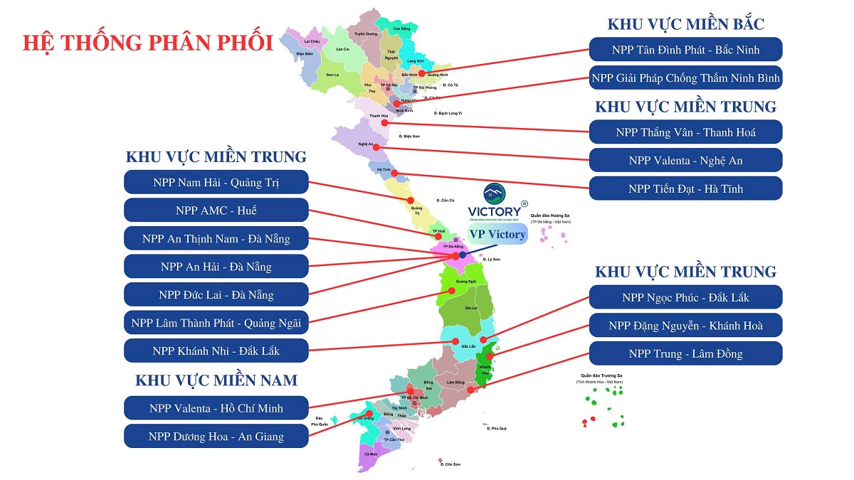 Nhằm mang đến giải pháp chống thấm bền vững cho mọi công trình, Victory đã phát triển mạng lưới NPP chống thấm tại nhiều tỉnh thành: